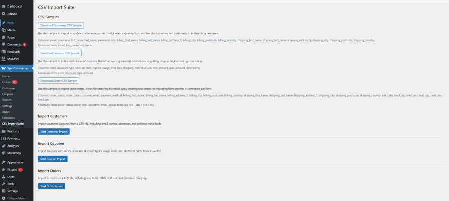 You can import Customers, Orders, and Coupons directly into WooCommerce using CSV files. The plugin is designed to handle all essential fields required for each data type.