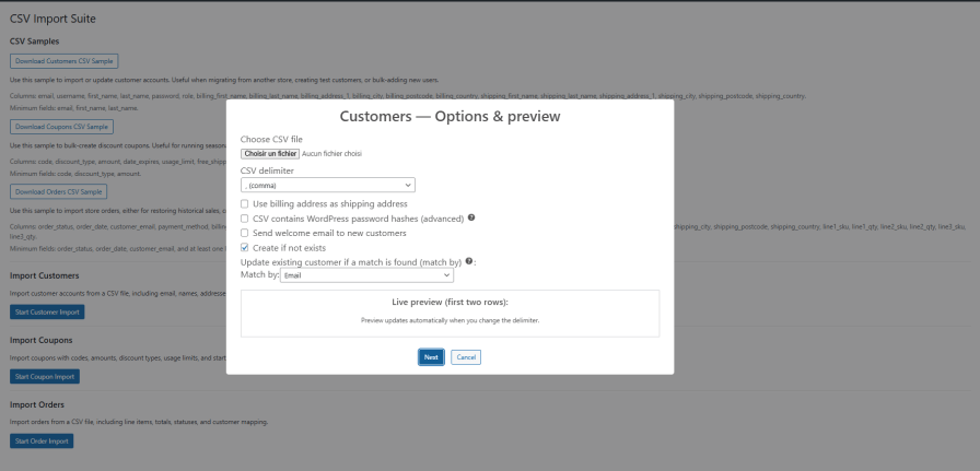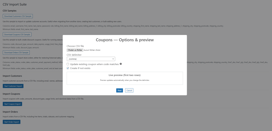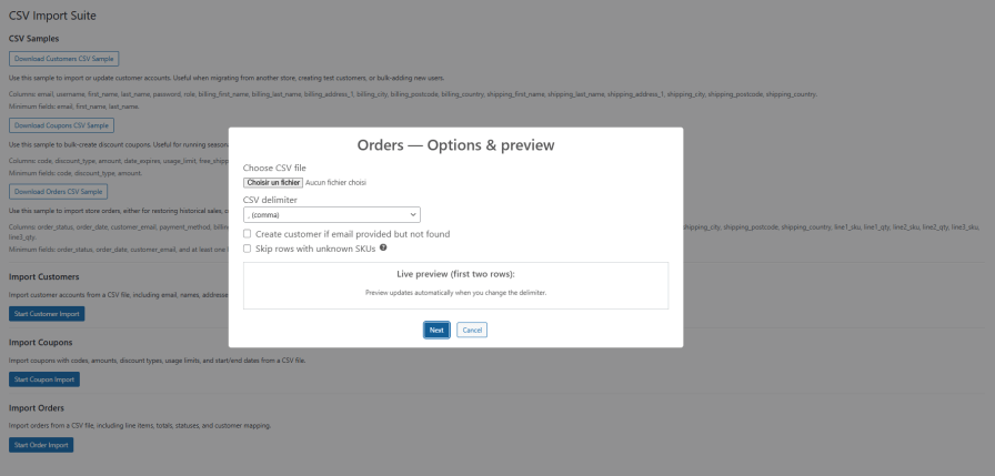 Import customers, orders, and coupons into WooCommerce from CSV files with smart mapping, validation, and detailed logs.