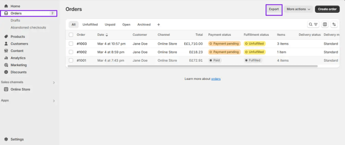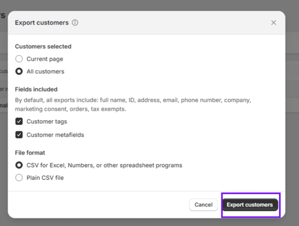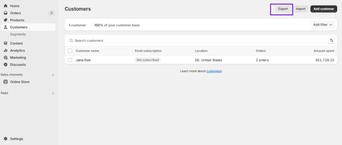 - Customer Data: Go to Customers > Export your selection (all, current page, selected, or filtered). This CSV includes names, emails, addresses, and tags.