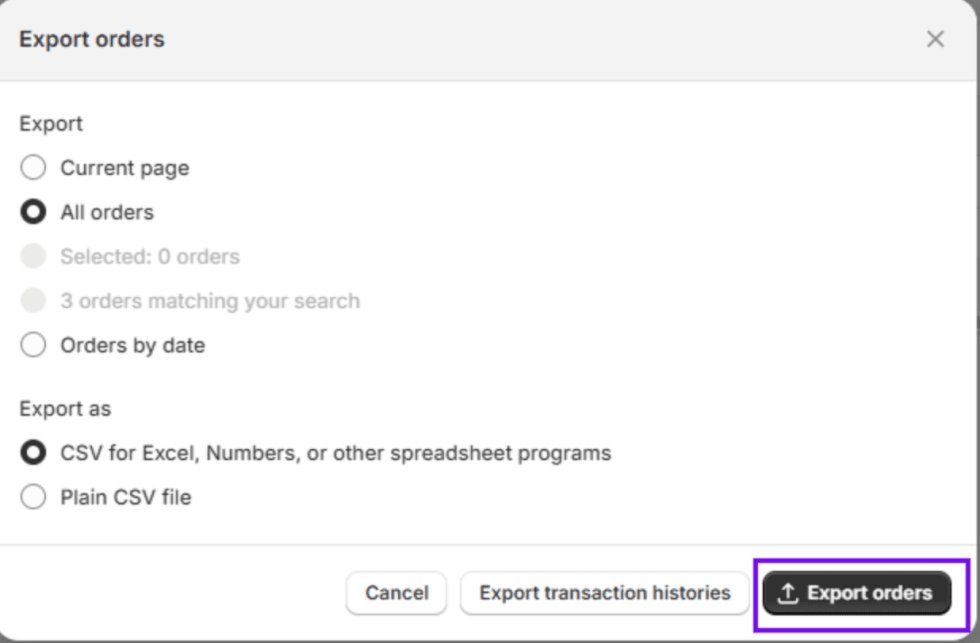 - Order Data: Navigate to Orders > Export your desired range (all orders, orders by date, or selected). Order CSVs can include transaction histories and may be emailed if the volume is large.