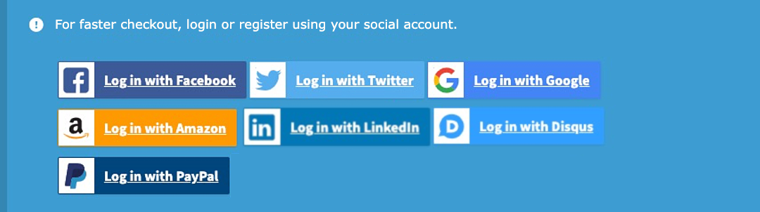 WooCommerce Social Login makes this process as easy and secure as possible – customers can log into your site using their Facebook, Twitter, Google, Amazon, LinkedIn, PayPal, or Disqus accounts instead of creating a new user account credentials.